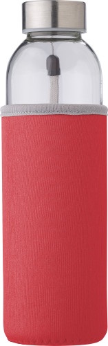 Sklenená fľaša (500 ml) s neoprénovým puzdrom. Kovová čiapka má pripevnený remienok na zápästie. Iba na studené nápoje.