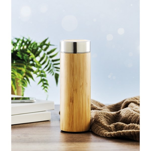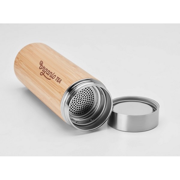 Dvojstenná nerezová fľaša s bambusovým povrchom a izolačným vákuom. 400 ml, prídavný čajový infuzer. Bambus je prírodný materiál a preto sa môže farba produktov mierne líšiť.
