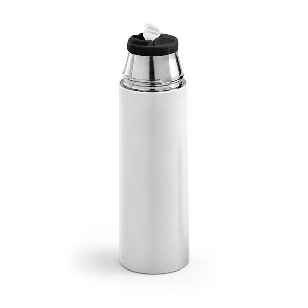 Termo fľaša z nehrdzavejúcej ocele a PP s dvojitým vákuovo izolovaným telom a objemom až 490 ml. Zahŕňa pohár. Dodávané v darčekovej krabičke