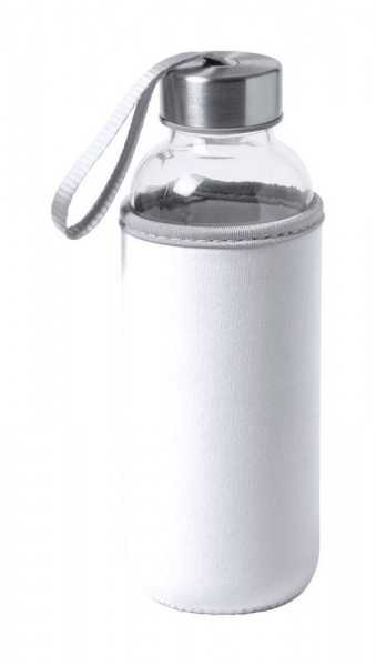 Sklenená športová fľaša s bambusovým viečkom a bielym neoprénovým obalom, 420 ml. Nevhodné pre sýtené nápoje.