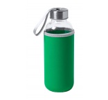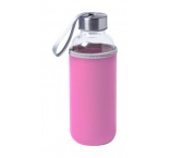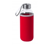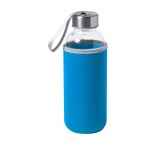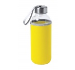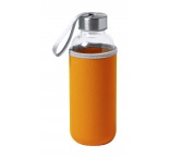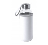 Sklenená športová fľaša s bambusovým viečkom a bielym neoprénovým obalom, 420 ml. Nevhodné pre sýtené nápoje.