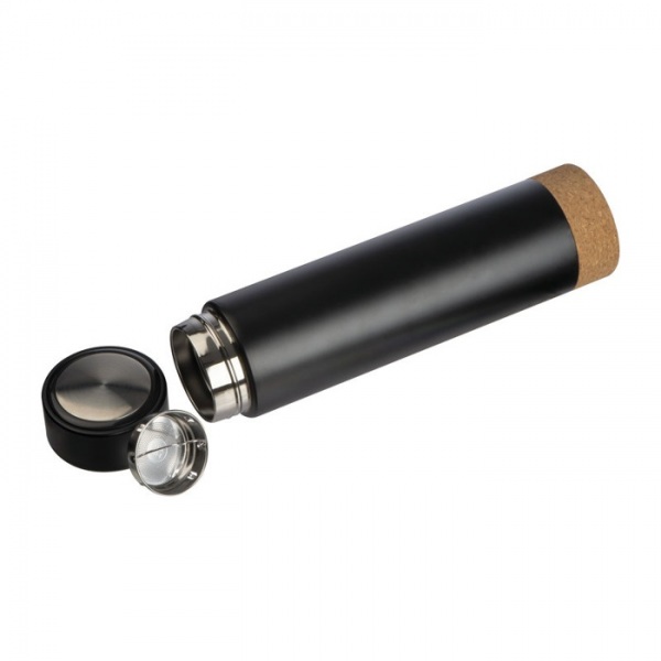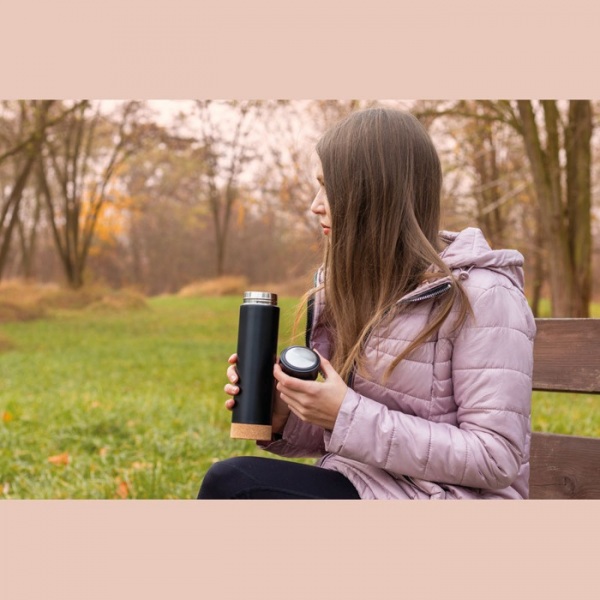 Dvojstenná vákuová termoska na pitie z nerezu s korkovým spodkom, sitkom a objemom 450 ml.