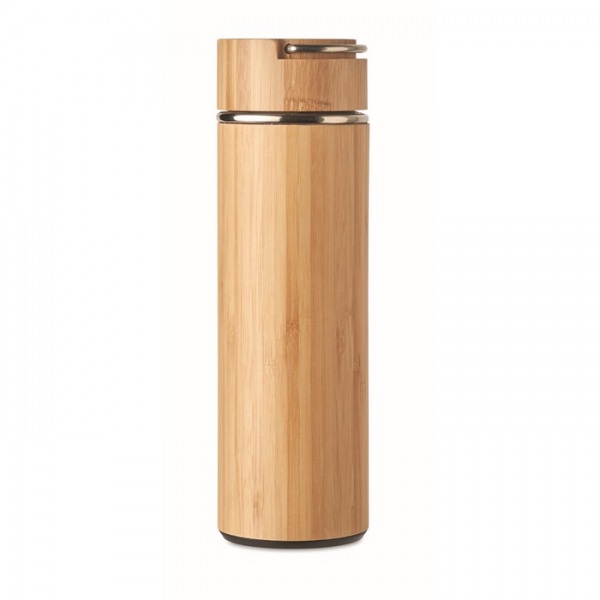 Dvojplášťová vákuová termoska z nerezovej ocele a bambusu s vnútorným čajovým sitkom. Objem 480 ml.