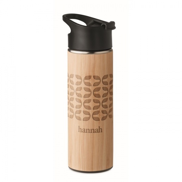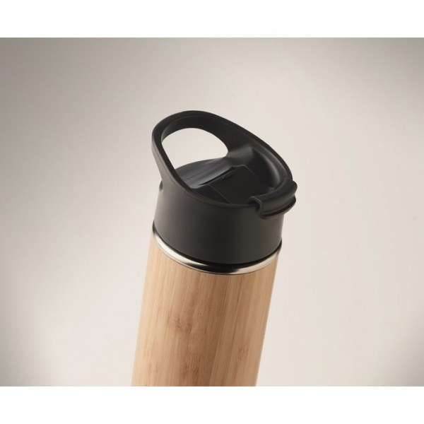 Izolačná vákuová fľaša z nerezovej ocele s dvojitou stenou, bambusovým povrchom a viečkom s úchytom z PP. Objem: 450 ml.