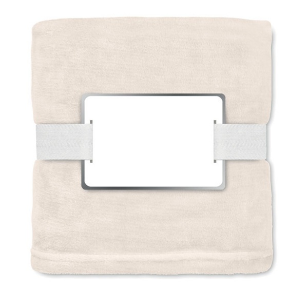 RPET flanelová flísová deka zabalená do stuhy s kartičkou pre potlač.