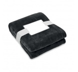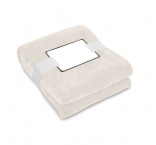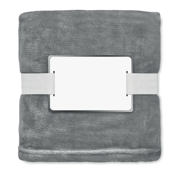 RPET flanelová flísová deka zabalená do stuhy s kartičkou pre potlač.