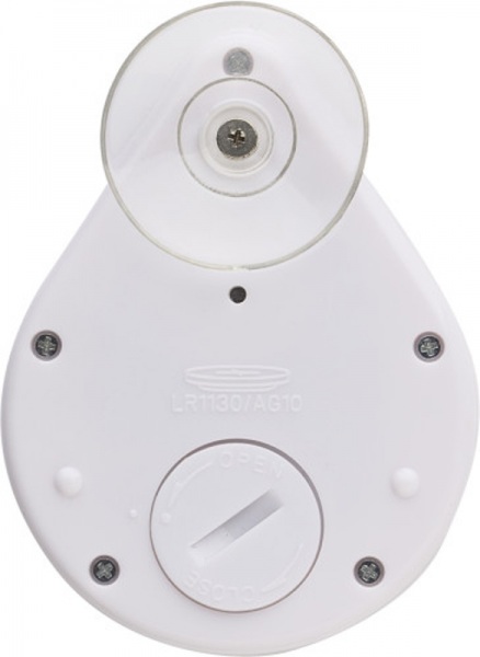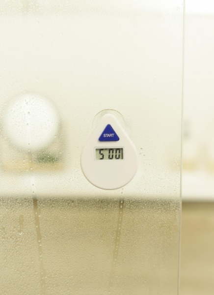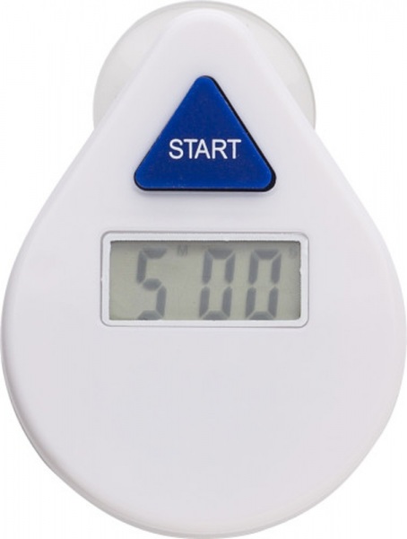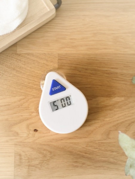Digitálny sprchový časovač s prísavkou na zadnej strane a tlačidlom na prednej strane.
