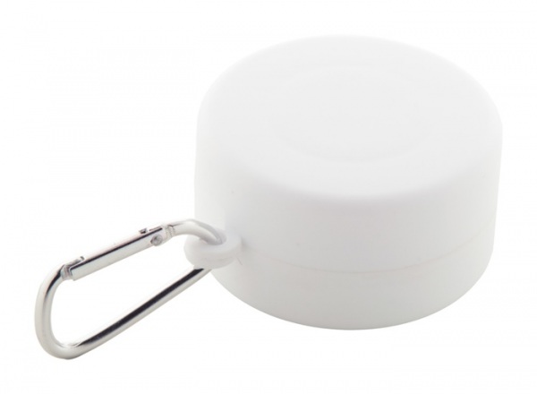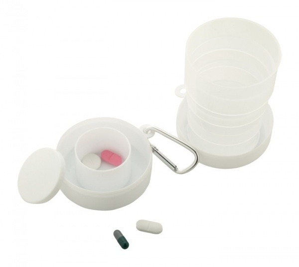 Skladací kelímok z recyklovaného PP plastu s priehradkou na pilulky a kovovou karabínou. 220 ml.
