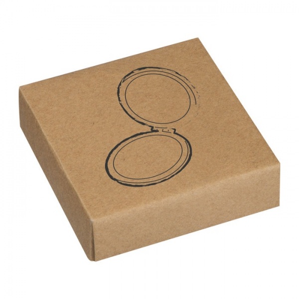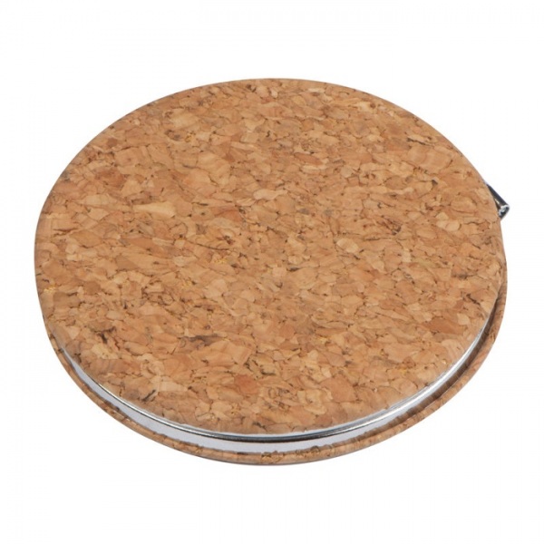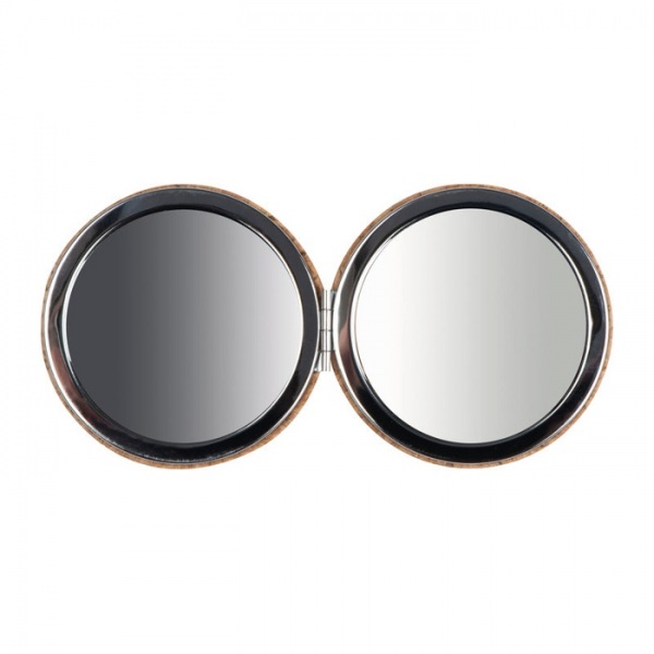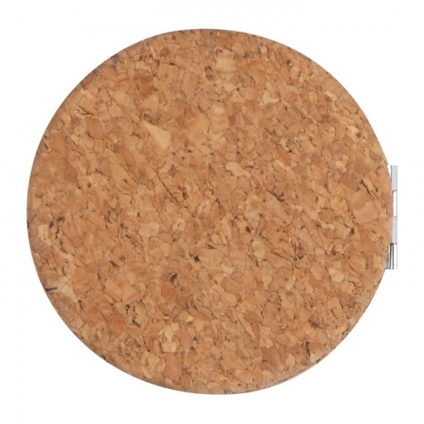 Dvojité kozmetické zrkadlo s korkovým povrchom. Vnútro s klasickým aj zväčšovacím zrkadlom.