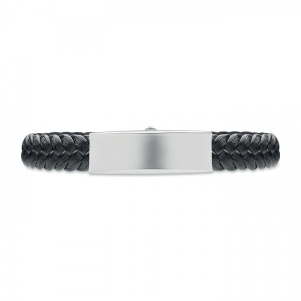 Splietaný manžetový náramok z umelej kože s kovaním z leštenej ocele. Push-lock spona. Obvod zápästia: 21 cm.