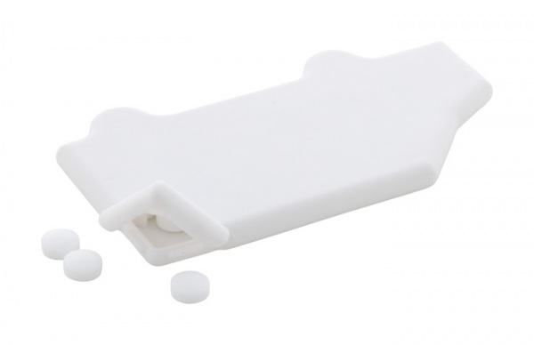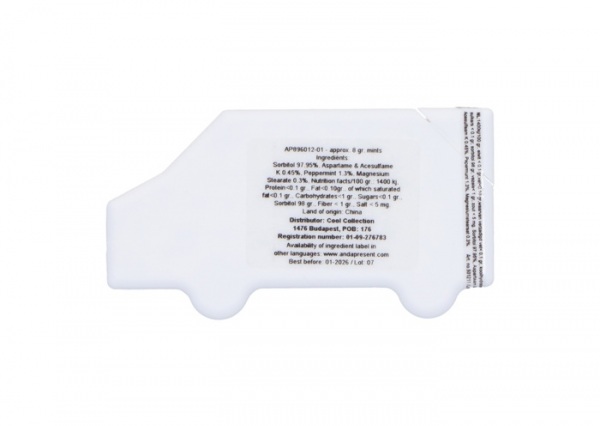 Plastový dávkovač mintových cukríkov v tvare auta s cca. 8 gramov mentolových cukríkov bez cukru.