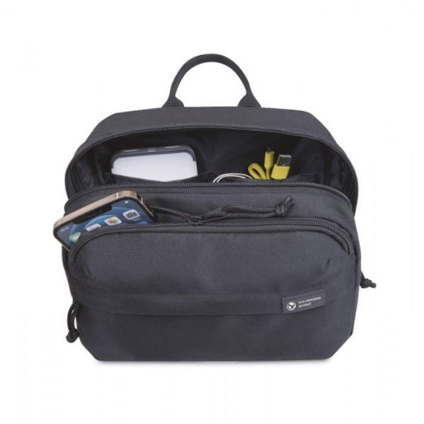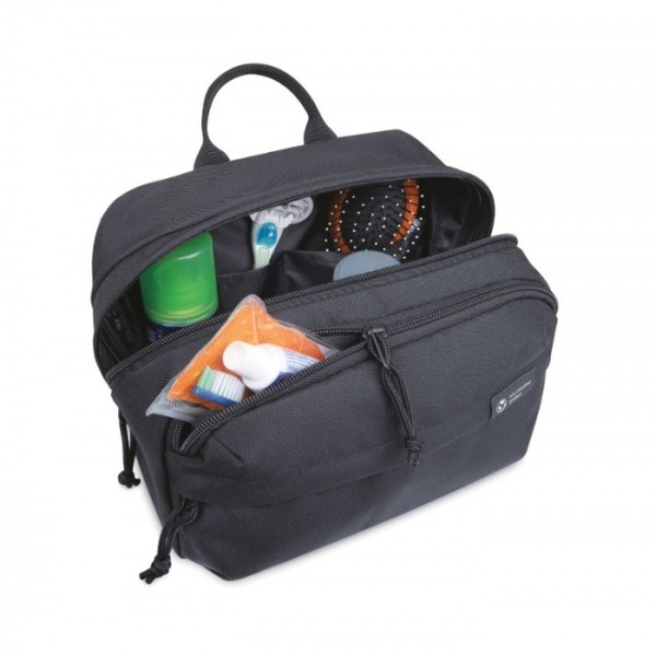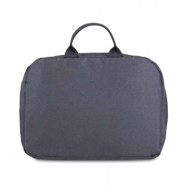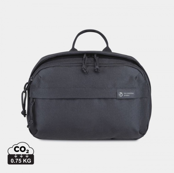 Toaletná taška z recyklovaných PET fliaš. Obsahuje priestrannú hlavnú priehradku s vnútornými vreckami na prehľadné usporiadanie toaletných potrieb. Predné vrecká na cestovné nevyhnutnosti a praktické horné madlo.
