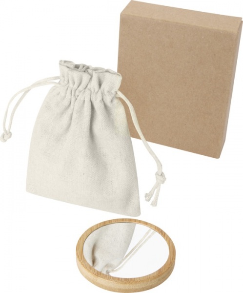 Okrúhle zrkadlo vyrobené z bambusu pre nádych prirodzenosti a elegancie. Dodávané v bavlnenom sáčku.