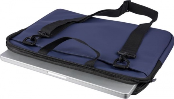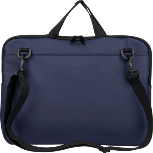 Taška na notebook z recyklovaného PU pre zariadenia do 15 palcov so 4 mm výplňou a podšívkou z recyklovaného materiálu 210D. Má predné vrecko na zips, zadné vrecko so suchým zipsom, dve krátke rúčky, nastaviteľný ramenný popruh.
