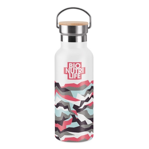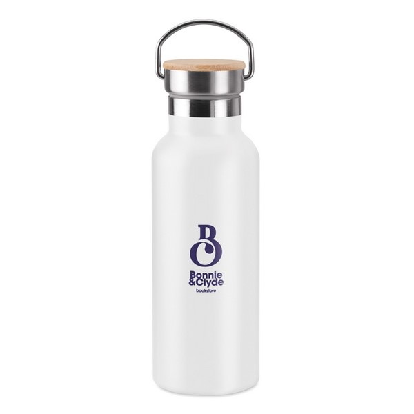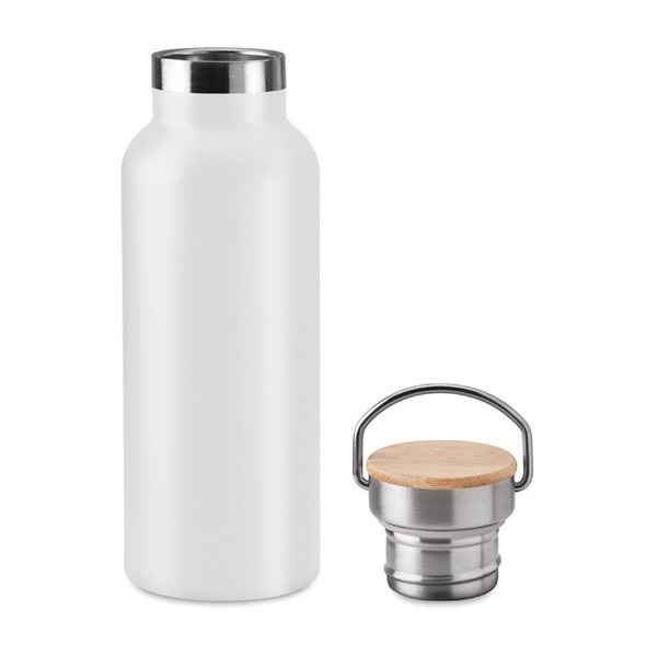 Dvojstenná nerezová termoska s izolačným vákuom. 500 ml, Viečko z bambusu s pútkom. Sublimačný potlač je možná iba na biely produkt. Netečie. Bambus je prírodný materiál, môže dôjsť k miernym zmenám farby, potlače a veľkosti.
