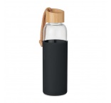 Skleněná láhev se silikonovým obalem, bambusovým víčkem s bavlněným poutkem na zápěstí. Není vhodná pro sycené nápoje. Objem: 500 ml.