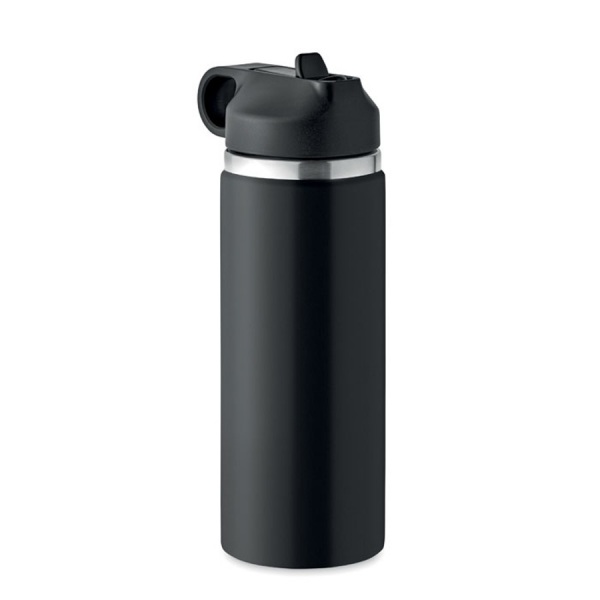 Dvojstenná fľaša z recyklovanej nerezovej ocele (90 % recyklovanej nerezovej ocele a 10 % nerezovej ocele). Viečko z PP, s úchytom a integrovanou slamkou. Objem: 500 ml.