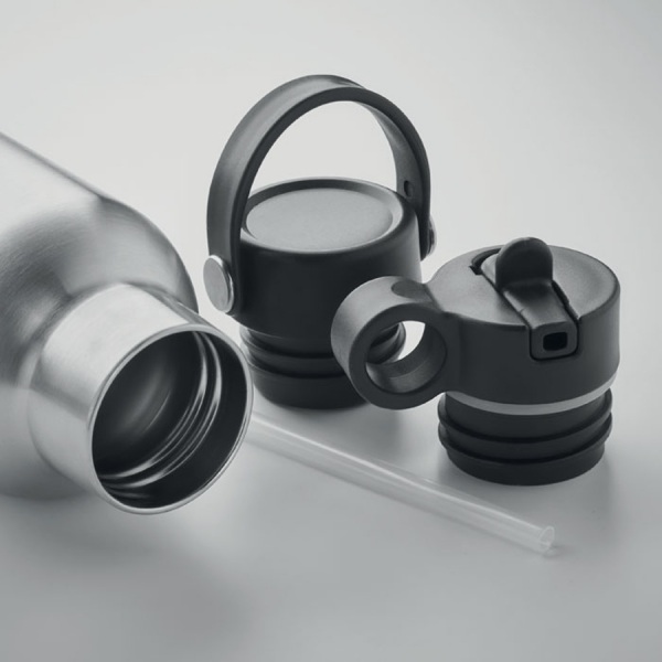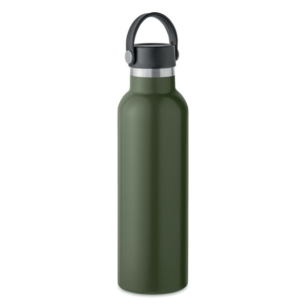 Dvojstenná fľaša z recyklovanej nerezovej ocele (90 % recyklovanej nerezovej ocele a 10 % nerezovej ocele). Vakuovo izolovaná fľaša s tesniacim šrubovacím uzáverom a prídavným vymeniteľným uzáverom so slamkou. Objem: 700 ml.