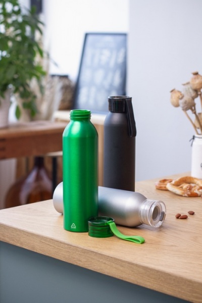 Športová fľaša z recyklovaného hliníka s viečkom v zodpovedajúcej farbe a silikónovým popruhom, 600 ml.