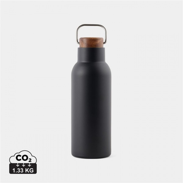 Termoska s uzáverom z akáciového dreva s kovovým pútkom. RCS je globálny štandard, ktorý umožňuje overiť použitie recyklovaného materiálu. Podiel recyklátu: 76%. Fľaša sa dá ľahko čistiť, iba na ručné umývanie. FSC® kraftová krabička