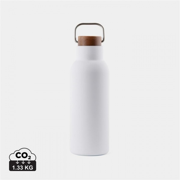 Termoska s uzáverom z akáciového dreva s kovovým pútkom. RCS je globálny štandard, ktorý umožňuje overiť použitie recyklovaného materiálu. Podiel recyklátu: 76%. Fľaša sa dá ľahko čistiť, iba na ručné umývanie. FSC® kraftová krabička