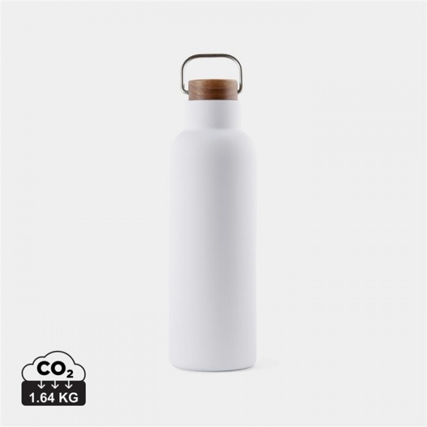 Termoska s uzáverom z akáciového dreva s kovovým pútkom. RCS je globálny štandard, ktorý umožňuje overiť použitie recyklovaného materiálu. Podiel recyklátu: 76%. Fľaša sa dá ľahko čistiť, iba na ručné umývanie. FSC® kraftová krabička