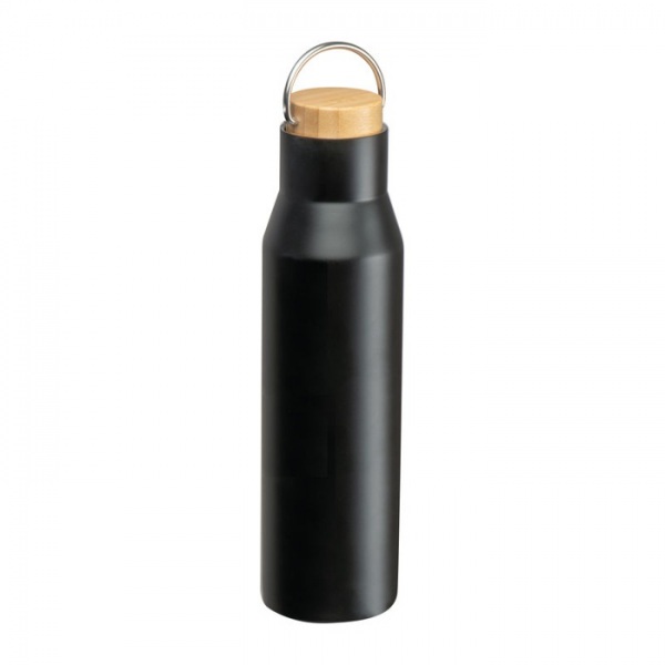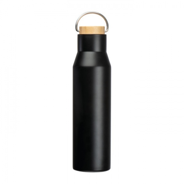 Fľaša na pitie z recyklovanej nehrdzavejúcej ocele s vákuovou izoláciou, bambusovým viečkom s držadlom a objemom 550 ml.