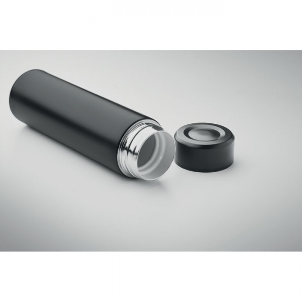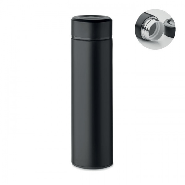 Dvojstenná vákuová izolačná fľaša z recyklovanej nerezovej ocele (90 % recyklovaná nerezová oceľ a 10 % nerezová oceľ) s keramickým vnútorným obložením. Nepriepustná. Objem: 420 ml.