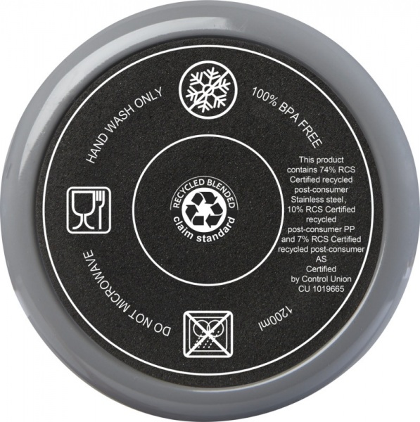 Termohrnček udrží nápoje horúce/studené. Vnútorná stena z rec. plastu, vonkajšia stena z rec. nereze (RCS). Prítlačné viečko proti vyšplechnutiu s 2 otvormi a otočným uzáverom. Dodáva sa s recyklovanou slamkou. Neodporúčame umývať v umývačke.