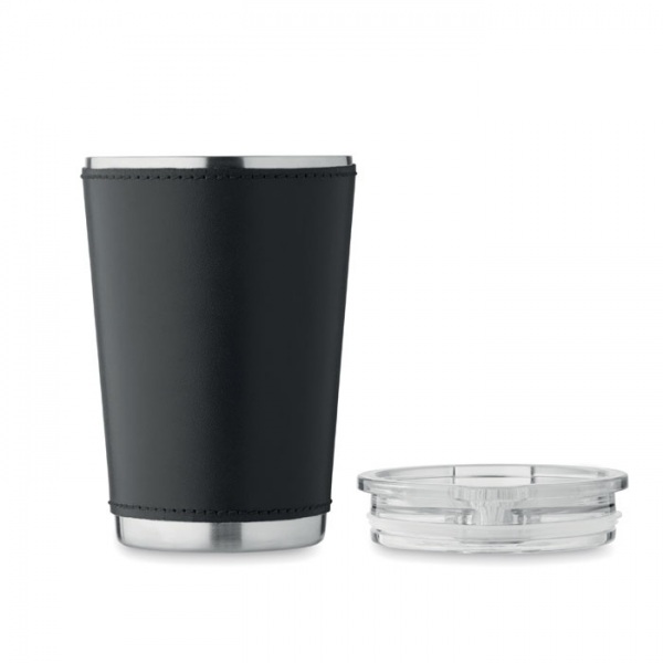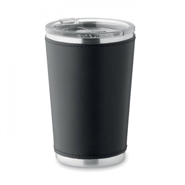 Dvojstenný pohár z recyklovanej nehrdzavejúcej ocele (90 % recyklovaná nehrdzavejúca oceľ a 10 % nehrdzavejúca oceľ) s odnímateľným puzdrom z PU kože. Veko s posuvným otvorom. Netečie. Kapacita: 350 ml.