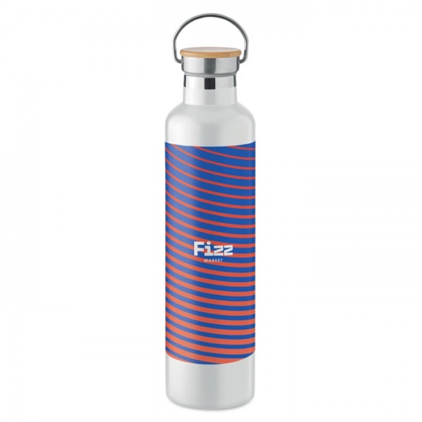 Dvojstenná termoska z nehrdzavejúcej ocele s bambusovým vekom a rukoväťou na prenášanie. Kapacita: 1000 ml. Bambus je prírodný materiál, môže dôjsť k miernym zmenám farby, potlače a veľkosti.