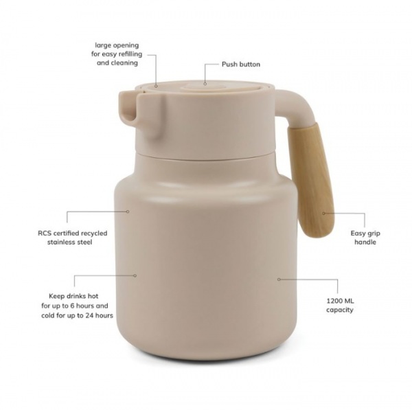 Veko je vybavené praktickým tlačidlom na otváranie a má veľký otvor pre ľahké dopĺňanie a čistenie. Dokáže udržať nápoje horúce 6 hodín a studené 24 hodín. Iba ručné umývanie, nevhodné do mikrovlnky. Certifikácia RCS. Podiel recyklátu: 62%.