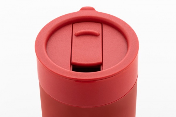 Silikónom potiahnutý keramický cestovný kelímok s PP plastovým odkvapkávacím viečkom. 300 ml.