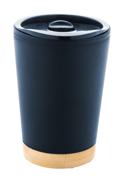 Dvojstenný termo hrnček izolovaný PP plastom s viečkom na pitie a bambusovým dnom, 260 ml.