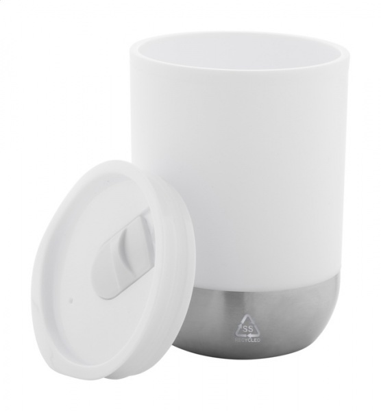 Dvojstenný termo hrnček s PP plastovou izoláciou s dnom z recyklovanej nerezovej ocele a viečkom na pitie. 300 ml.