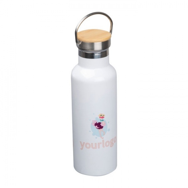 Dvojstenná vákuová fľaša z nehrdzavejúcej ocele s objemom 500 ml a uškom na prenášanie. Povrch vhodný na sublimačnú tlač.