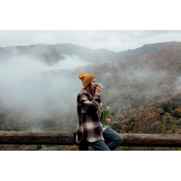 Dvojstenná vákuovo-izolačná fľaša z recyklovanej nehrdzavejúcej ocele (90 % recyklovanej nehrdzavejúcej ocele a 10 % nehrdzavejúcej ocele) s bočným uchom. S PP viečkom. Objem: 1 l.