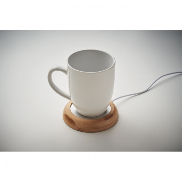 Ohrievač hrnčekov z bambusu. Udrží nápoje teplé do maximálnej teploty 45 °C. Má USB kábel na pripojenie.