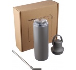 Termoska s vnútrom z nerezovej ocele 304 a vonkajšou stranou z nerezovej ocele 201. 2 viečka: viečko z PP s rukoväťou na prenášanie a priehľadné viečko z PS na použitie s nerezovou slamkou so silikónovou špičkou a držiakom. Hnedá krabička.