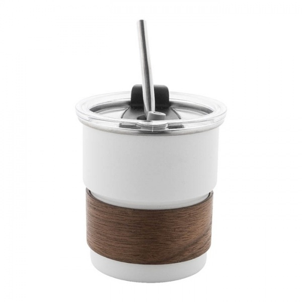 Jednostenný cestovný hrnček z recyklovanej nerezovej ocele s rukoväťou z orechového dreva, plastovým viečkom a slamkou z recyklovanej nerezovej ocele. 260 ml.