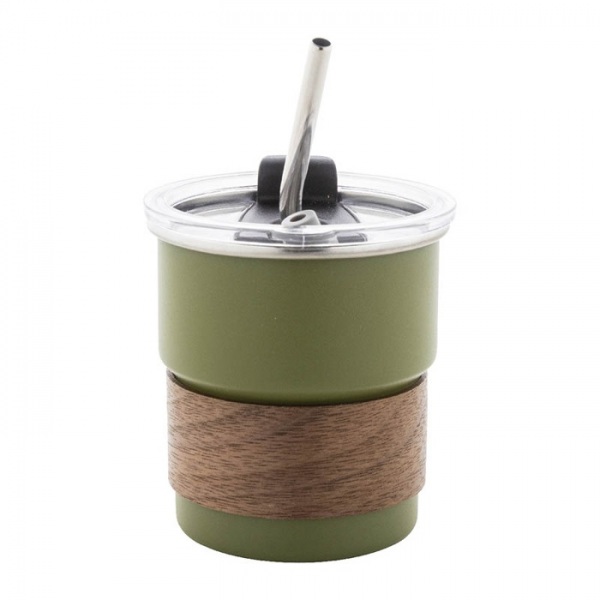 Jednostenný cestovný hrnček z recyklovanej nerezovej ocele s rukoväťou z orechového dreva, plastovým viečkom a slamkou z recyklovanej nerezovej ocele. 260 ml.