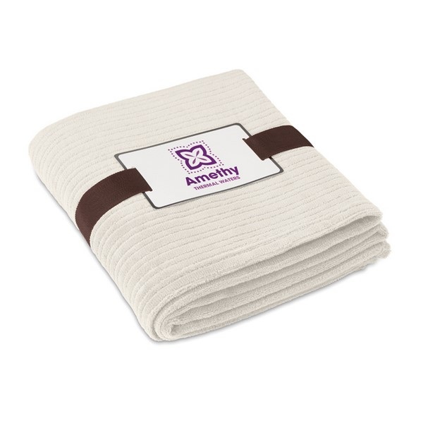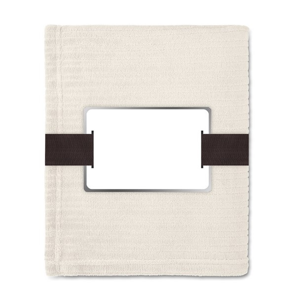 Fleecová deka 240g/m2 zabelaná v stuhe s kartičkou na potlač.