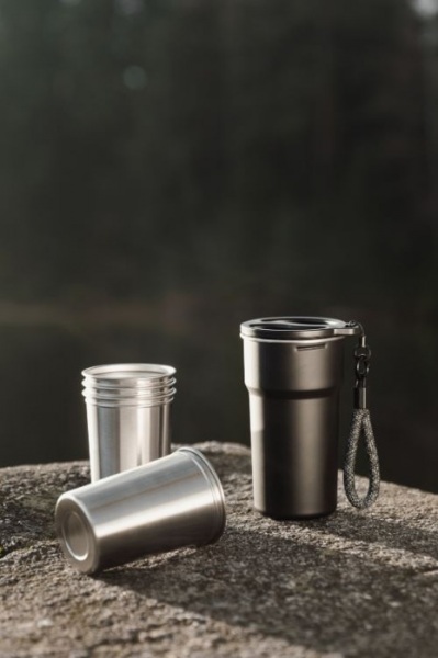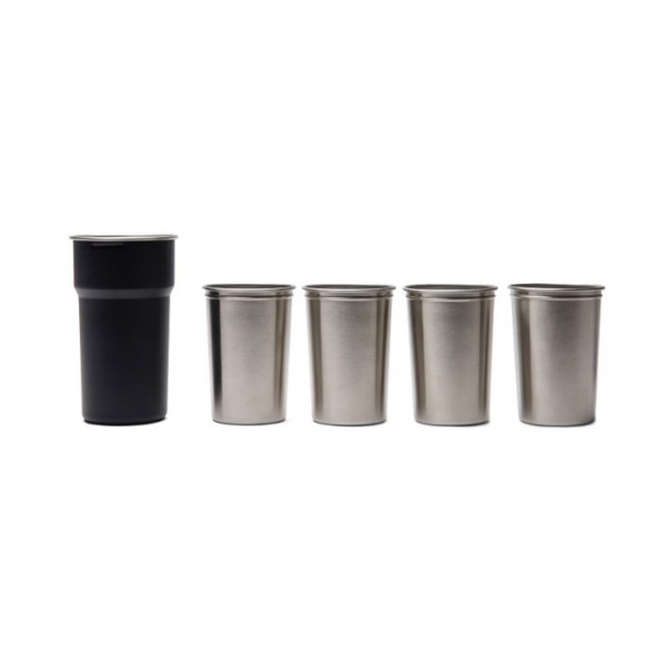 Štyri poháre s objemom 250 ml sú uložené vo väčšom 450 ml pohári s praktickým pútkom na prenášanie. Nevhodné do umývačky riadu a mikrovlnky, iba ručné umývanie. Obsahuje 79 % recyklovanej ocele certifikovanej podľa RCS.