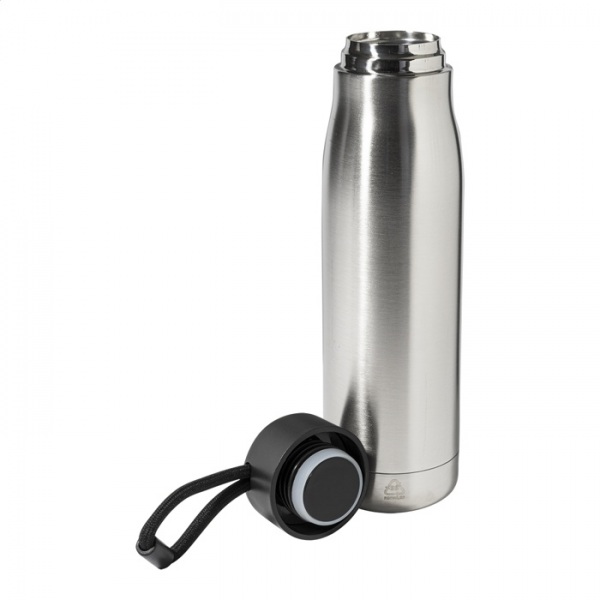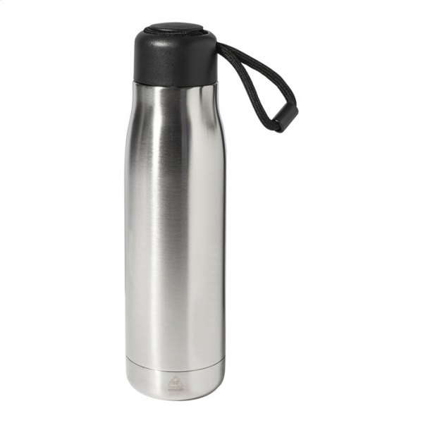 Dvojstenná, vákuovo izolovaná fľaša z recyklovanej nerezovej ocele s PP viečkom a integrovaným pútkom na nosenie so šnúrkou. 500 ml.