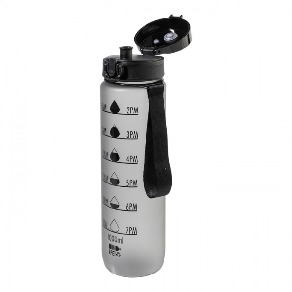 Športová fľaša z matného RPET s motivačným objemovým a časovým značením, s automaticky otvárateľným odklápacím viečkom s bezpečnostným zámkom a pútkom na nosenie. 1000 ml. Bez BPA. Nevhodné pre sýtené nápoje.