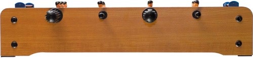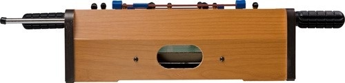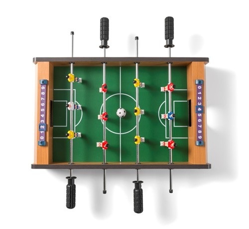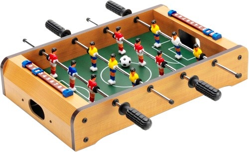Stolný futbal, ktorý si zákazník zloží sám, so 6 plastovými hráčmi na každej strane a s loptou. Materiál: MDF a drevovláknitá doska strednej hustoty.