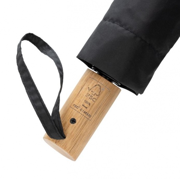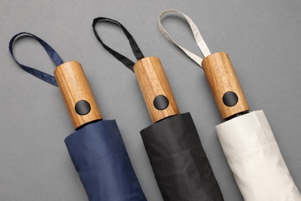 Kompaktný 3-dielny automatický dáždnik má kovový rám, rebrá zo sklených vlákien a rukoväť z akáciového dreva (FSC®). Strieška z RPET s indikátorom AWARE™. Výťažok 2% ide na podporu iniciatívy Water.org. Drevená rukoväť môže mať farebné rozdiely.