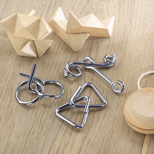 Súprava troch kovových hlavolamov v bavlnenom puzdre.