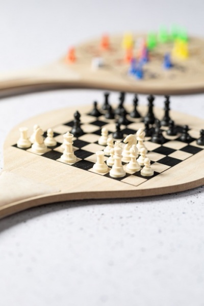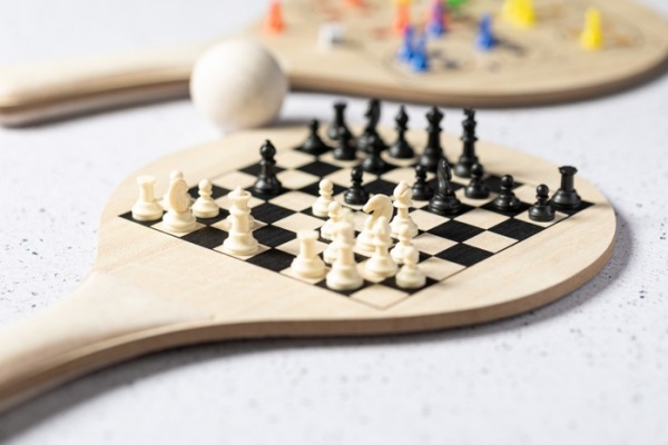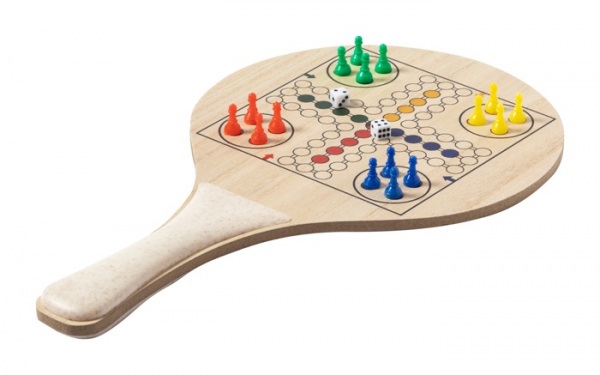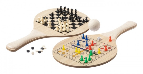 Plážový tenis s 2 raketami a jednou loptičkou, vyrobený z dreva a ekologického plastu z pšeničnej slamy. Vrátane 3 doskových hier, ktoré je možné hrať na raketách. V bavlnenom vrecúšku so sťahovacou šnúrkou.