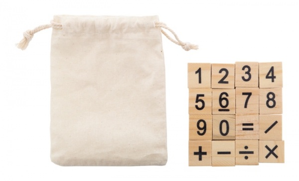 Drevená vzdelávacia hra na počítanie v bavlnenom sáčku so sťahovacou šnúrkou. S 32 dielikmi, vrátane čísel a matematických operácií.